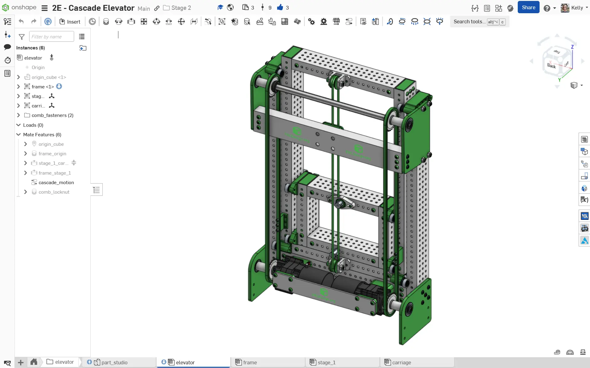 The Stage 2D Cascade Elevator is a subsystem with a static portion and two subassemblies that slide linearly. This contains a part studio, a static frame/gearbox assembly, assemblies for the first stage and carriage, and a top-level assembly combining the 3 subassemblies with slider mates.