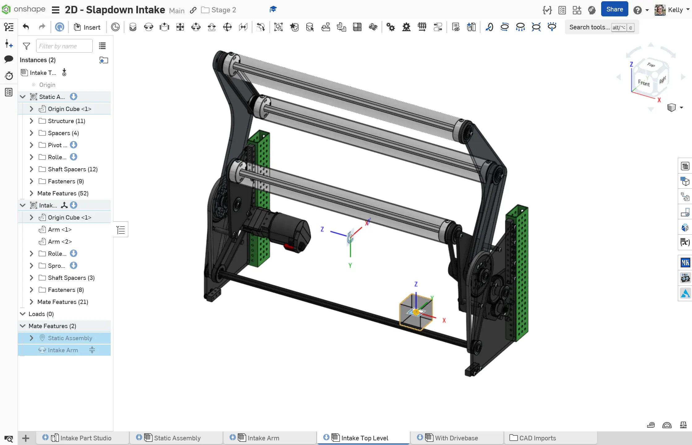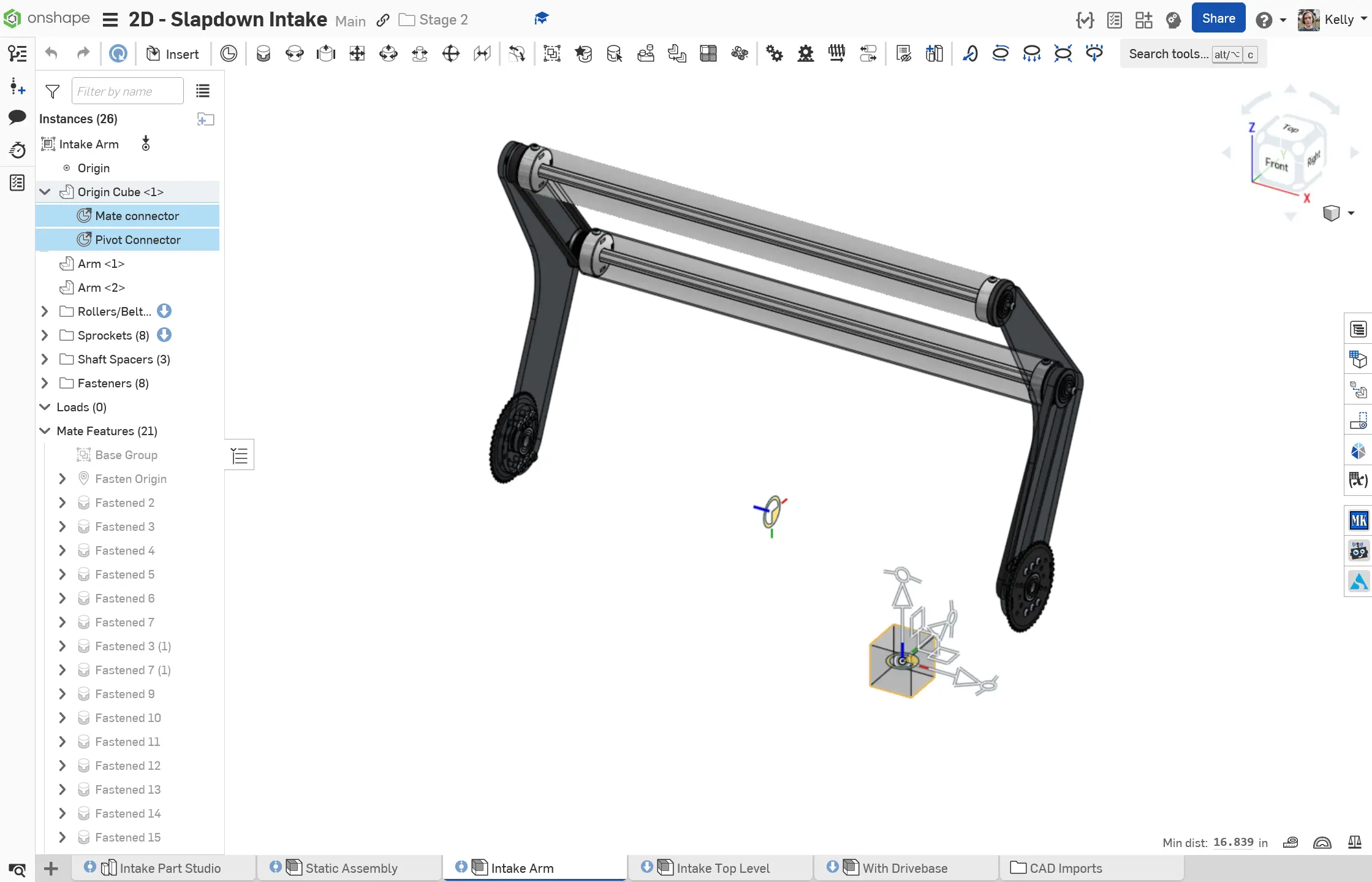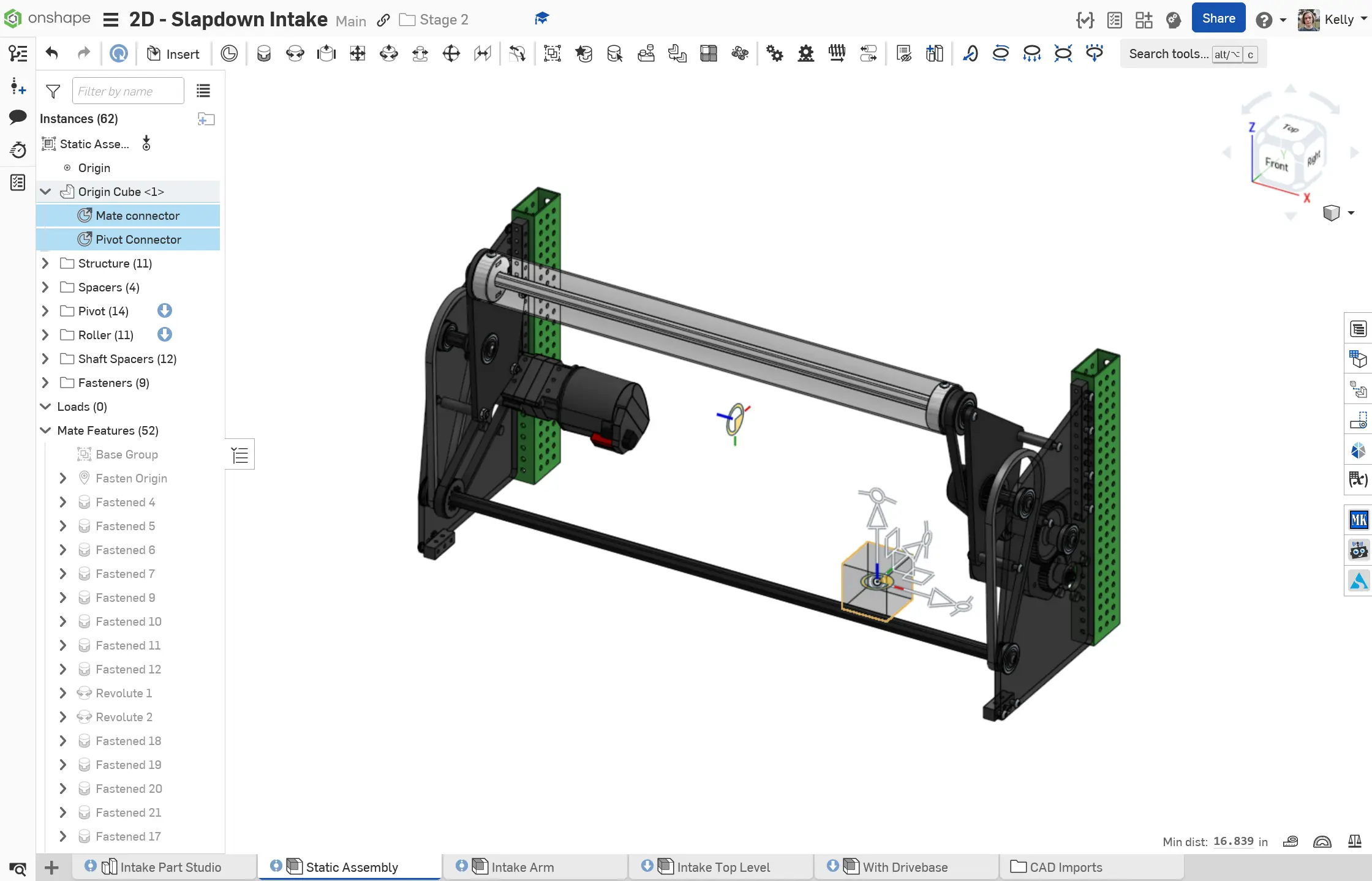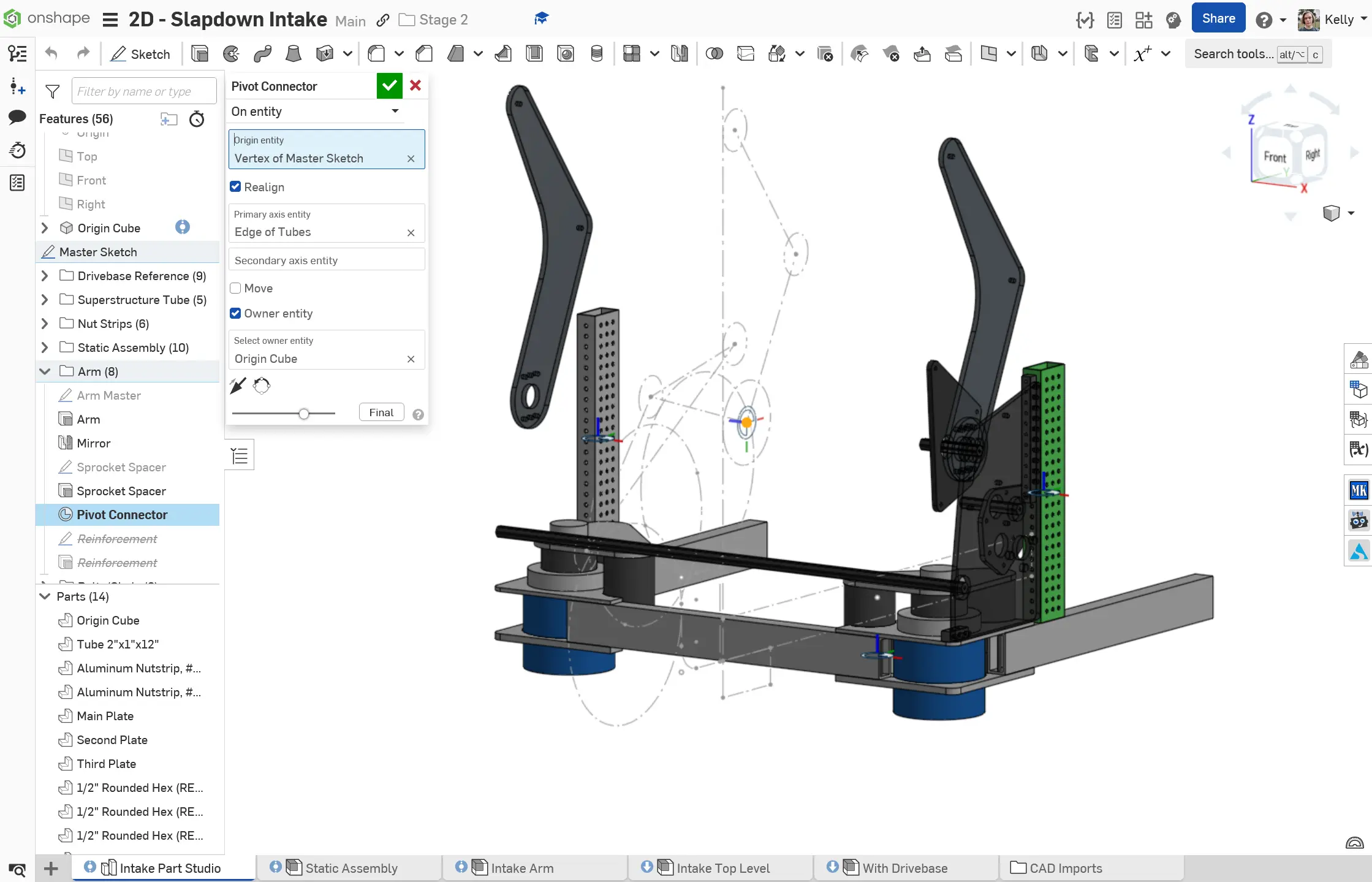 The Stage 2C Slapdown Intake is a subsystem with a static portion and a pivoting portion. An extra mate connector is added for the pivot on the main layout sketch, owned by the origin cube