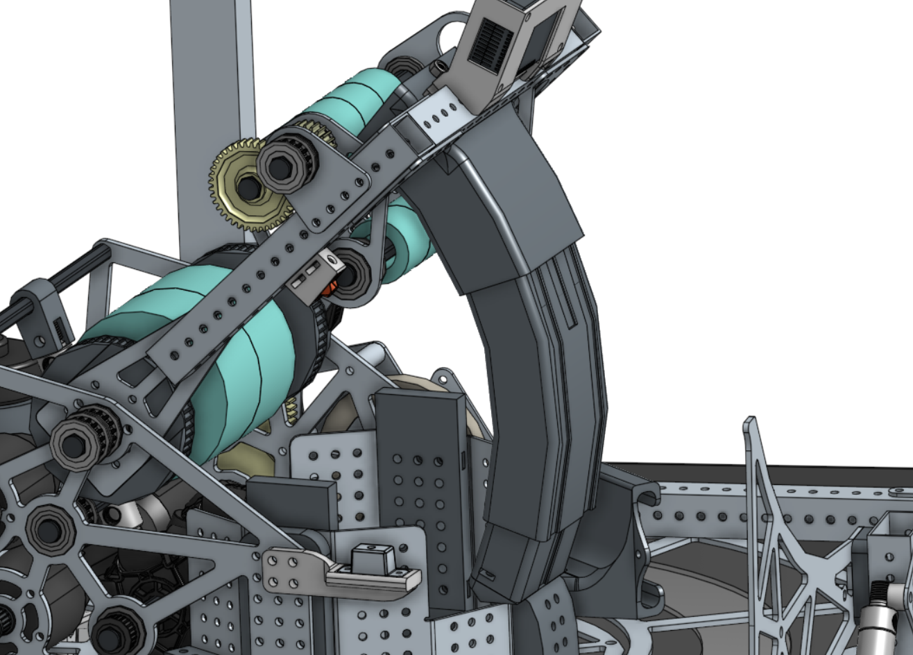 Tooth Strength: Using a lower diametral pitch (fewer teeth per pitch circle length) will make the teeth thicker, in turn making the gear stronger. Both of the above principles were used by 2910 in this example of their 2022 shooter hood.