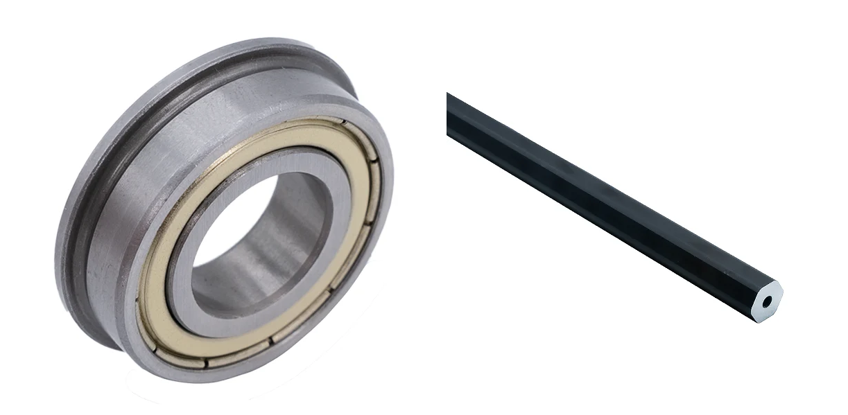 Bearings allow shafts to spin independently of plates and/or things to spin independently of shafts. Standard hex shafts use 1/2" hex bearings, while rounded hex shafts can use round bearings for easier assembly.
