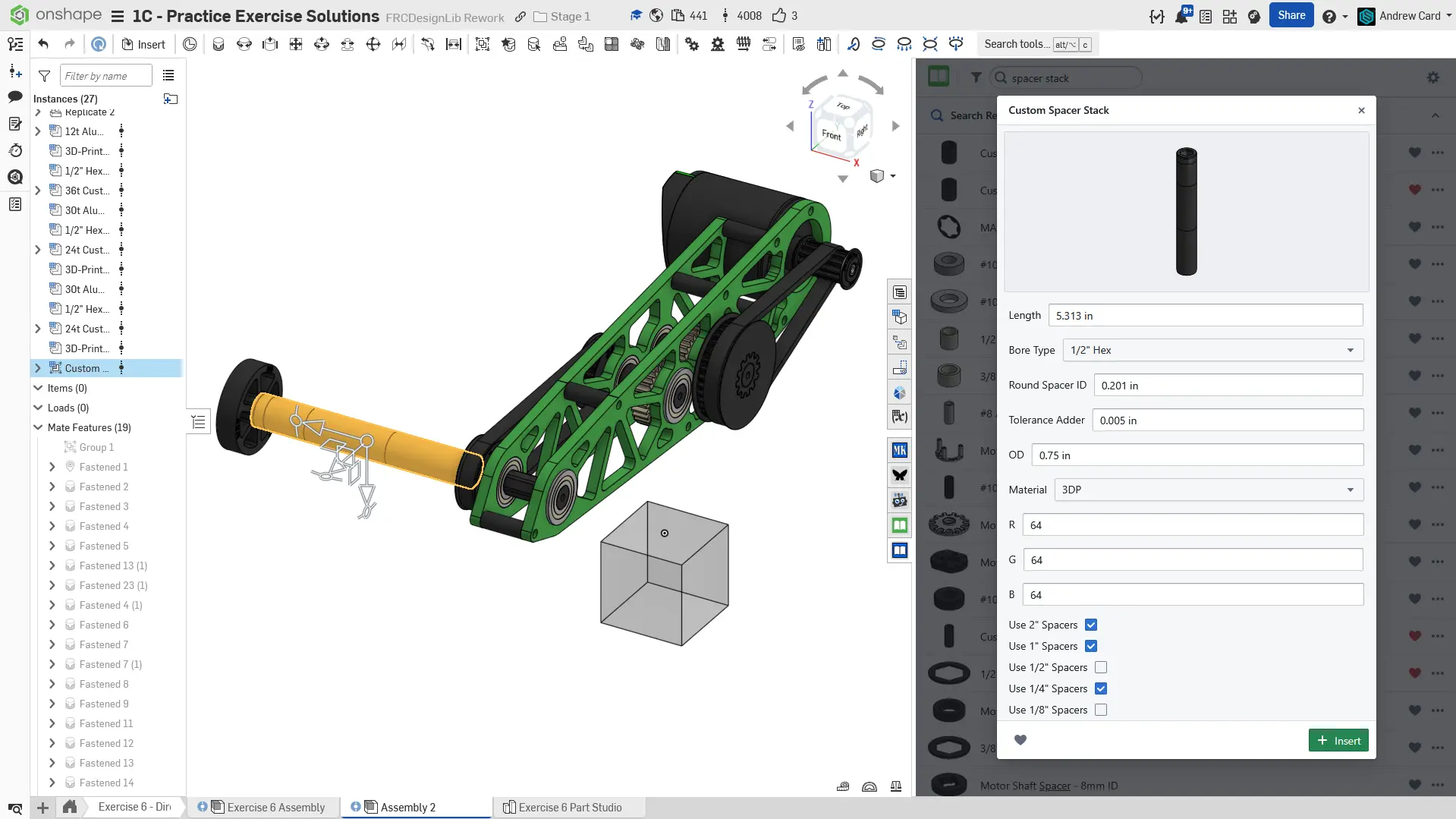 So far, you've used both custom spacers generated with the Spacer Featurescript as well as COTS 3/8" OD spacers from FRCDesignLib (the WCP Aluminum Spacers). There are pros and cons to using COTS or custom spacers that you should discuss with your team.