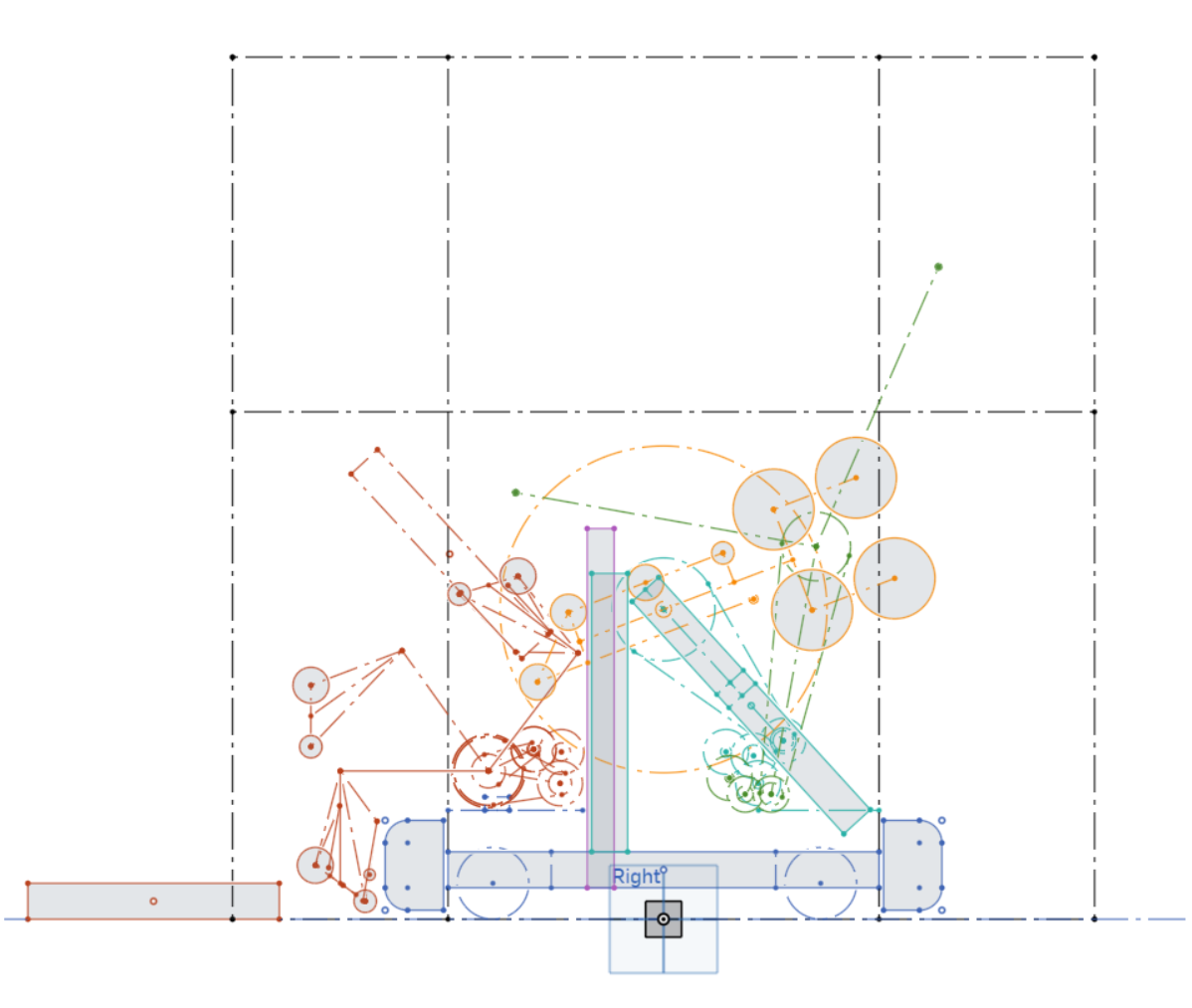 To achieve this, a main layout sketch is utilized. Sometimes these are also referred to as "master" sketches. The main layout sketch is a series of sketches that capture the major dimensions of each mechanism, field element interactions, and robot size constraints. Then, the main layout sketch(es) are inserted into each mechanism's part studio and the individual components are then modeled around the imported layout sketch. More information on layout sketches can be found on the Layout Sketch Best Practices page.