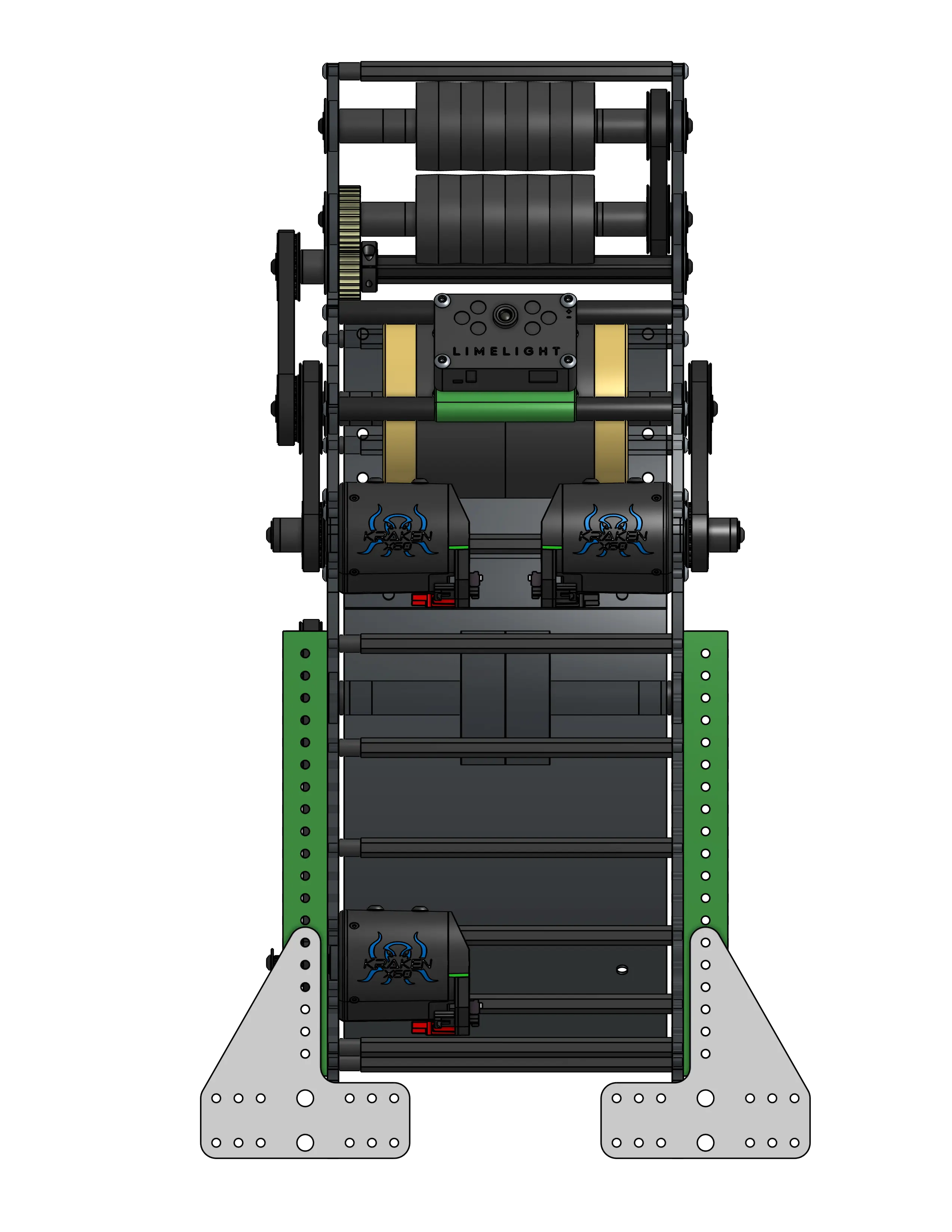 This shooter uses two 1/4" polycarbonate plates for the sides. The polycarbonate is chosen because it is lighter and easier to machine than aluminum, while the 1/4" thickness is rigid enough for shooters when properly supported. In the reference design, the plates are mounted to the bottom drive rails and reinforced with support beams. Standoffs, which also serve as a camera mount and ball guide, keep the plates spaced apart, ensuring the overall rigidity of the shooter.