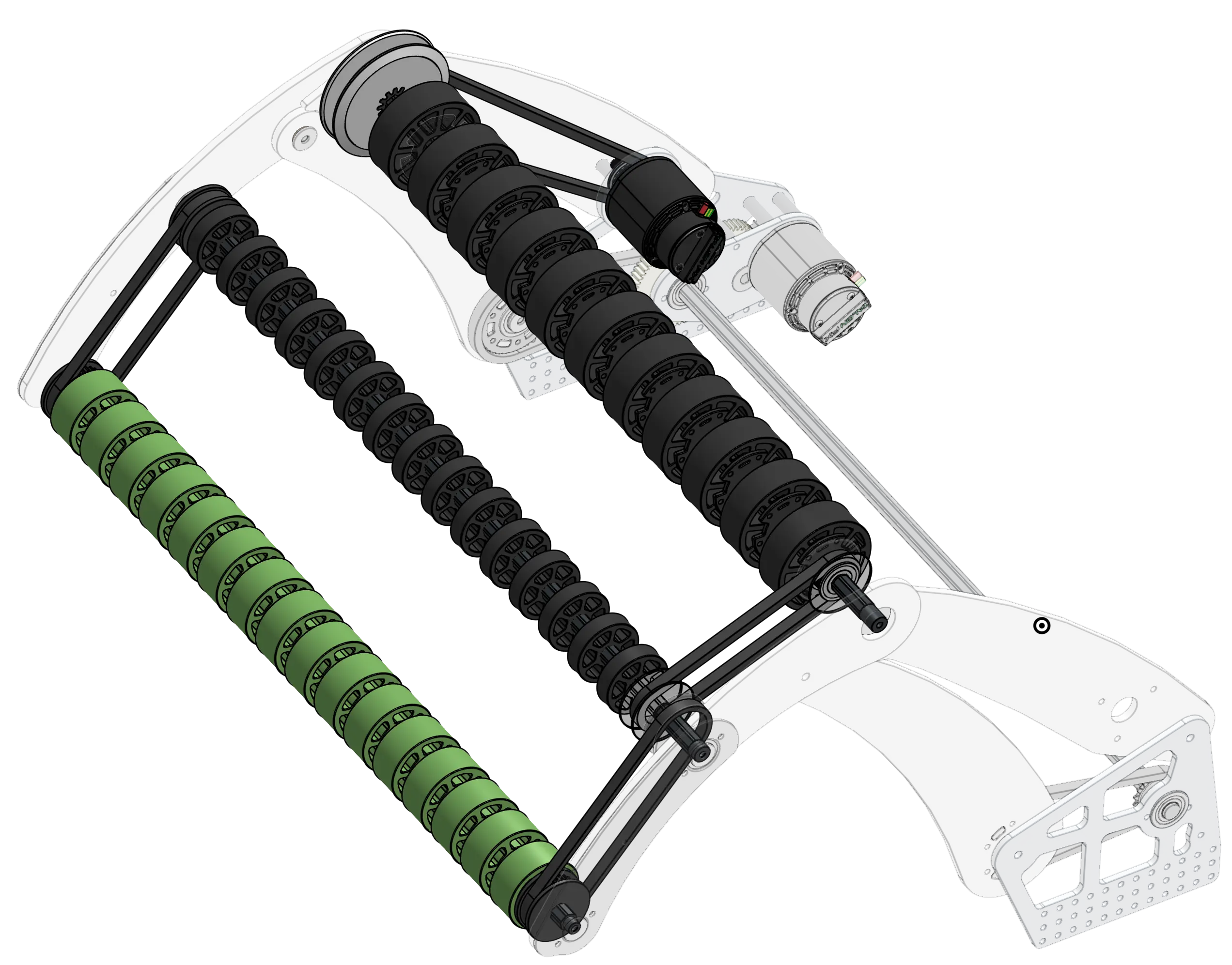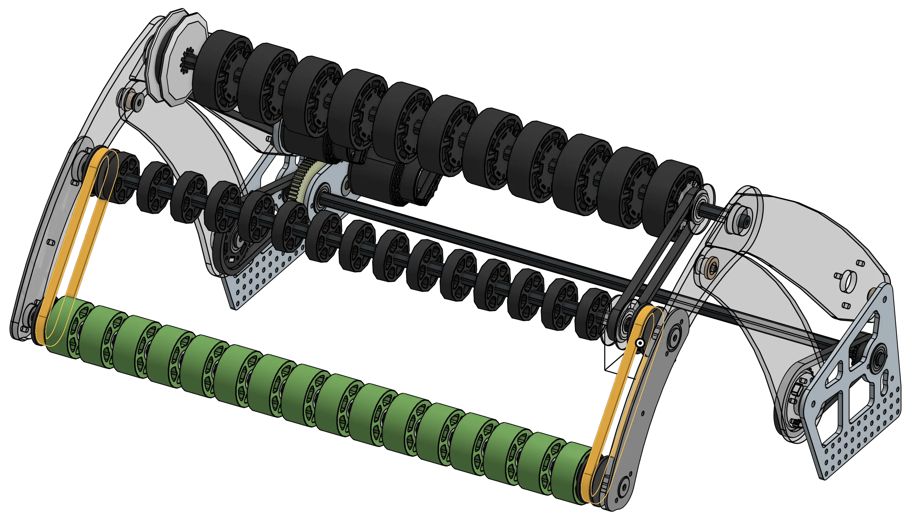 The intake rollers are powered by a Falcon 500, and power is transferred using HTD 5mm timing belts. The intake is designed with the "touch it own it" design philosophy, and it spans the full width of the robot to make intaking as easy as possible for the driver. The intake is "geared" (using belt and pulley reductions) so that the surface speed of the rollers are approximately 2.5x the speed of the robot. This allows the robot to intake balls even while driving into them at full speed. Each level of wheels is also belted together such that they have equal surface speeds, despite their different diameters.