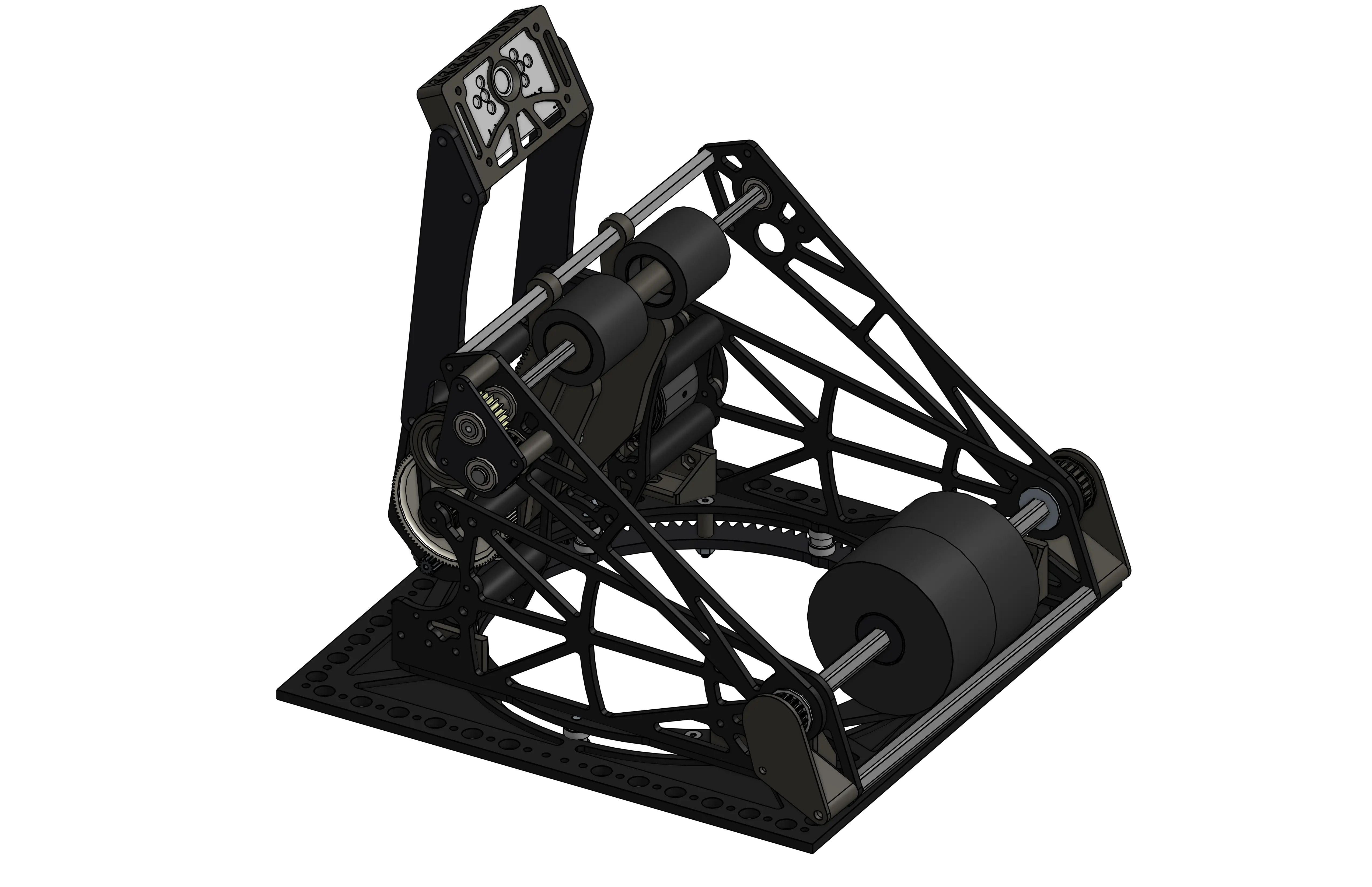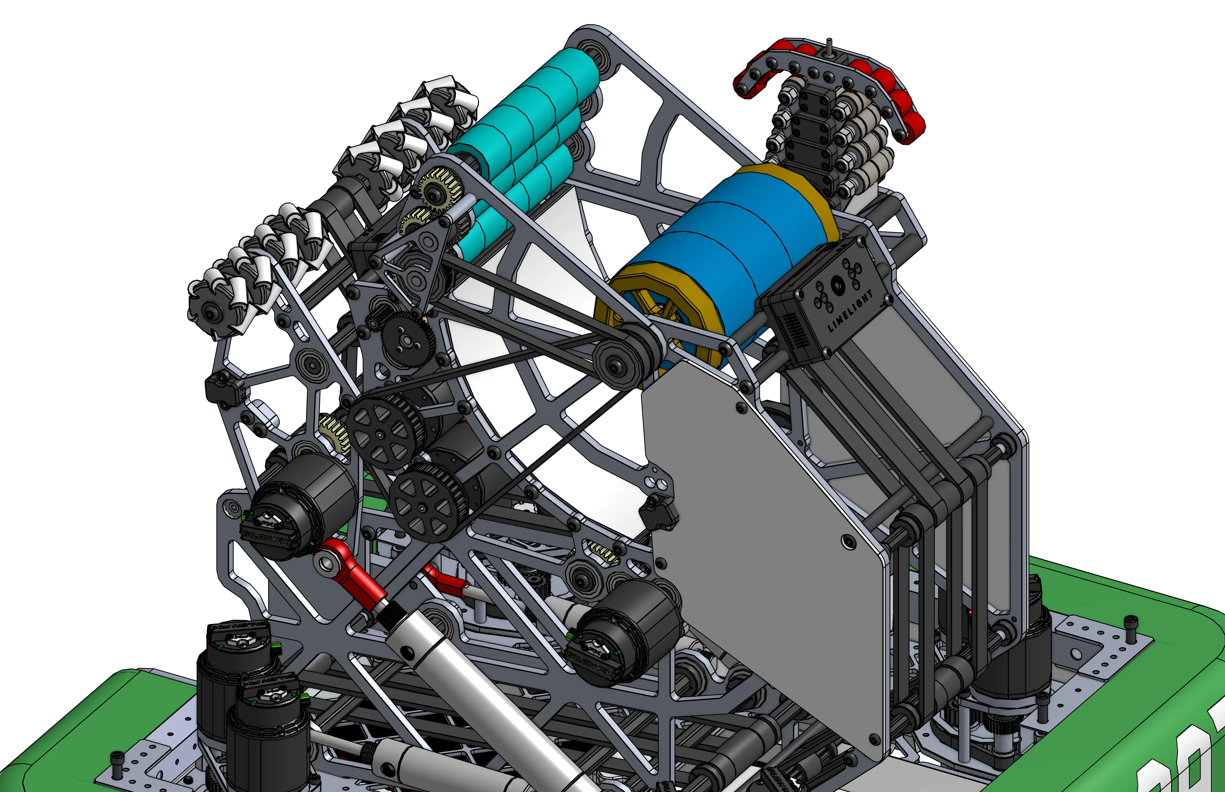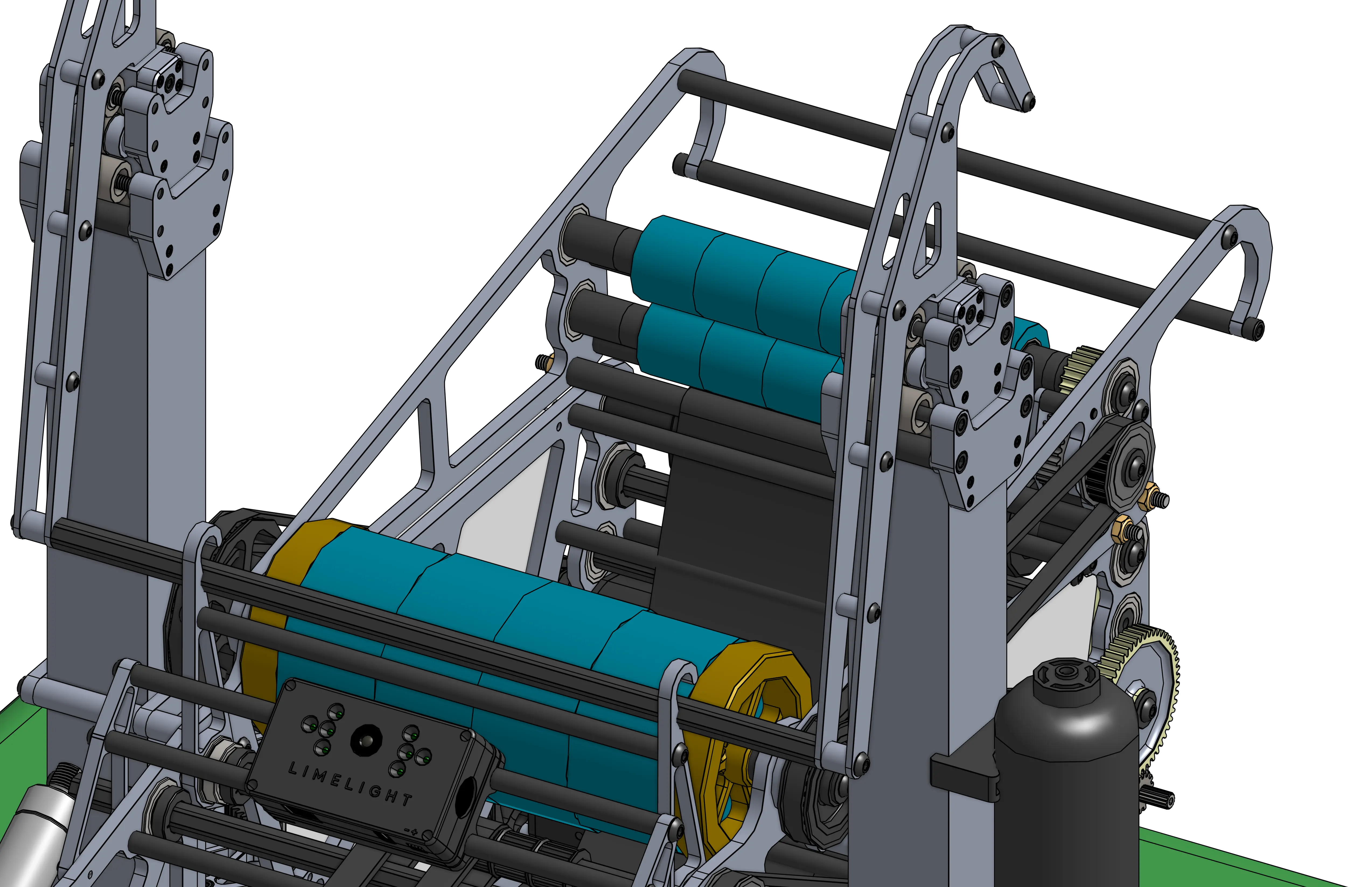 A ball shooter featuring a rack gear actuated hood and hood rollers